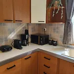 Deze gesitueerde in Mikro Omikron heeft een eethoek met koffie- en theevoorzieningen. De keuken heeft ook een koelkast, een oven en keukengerei.
